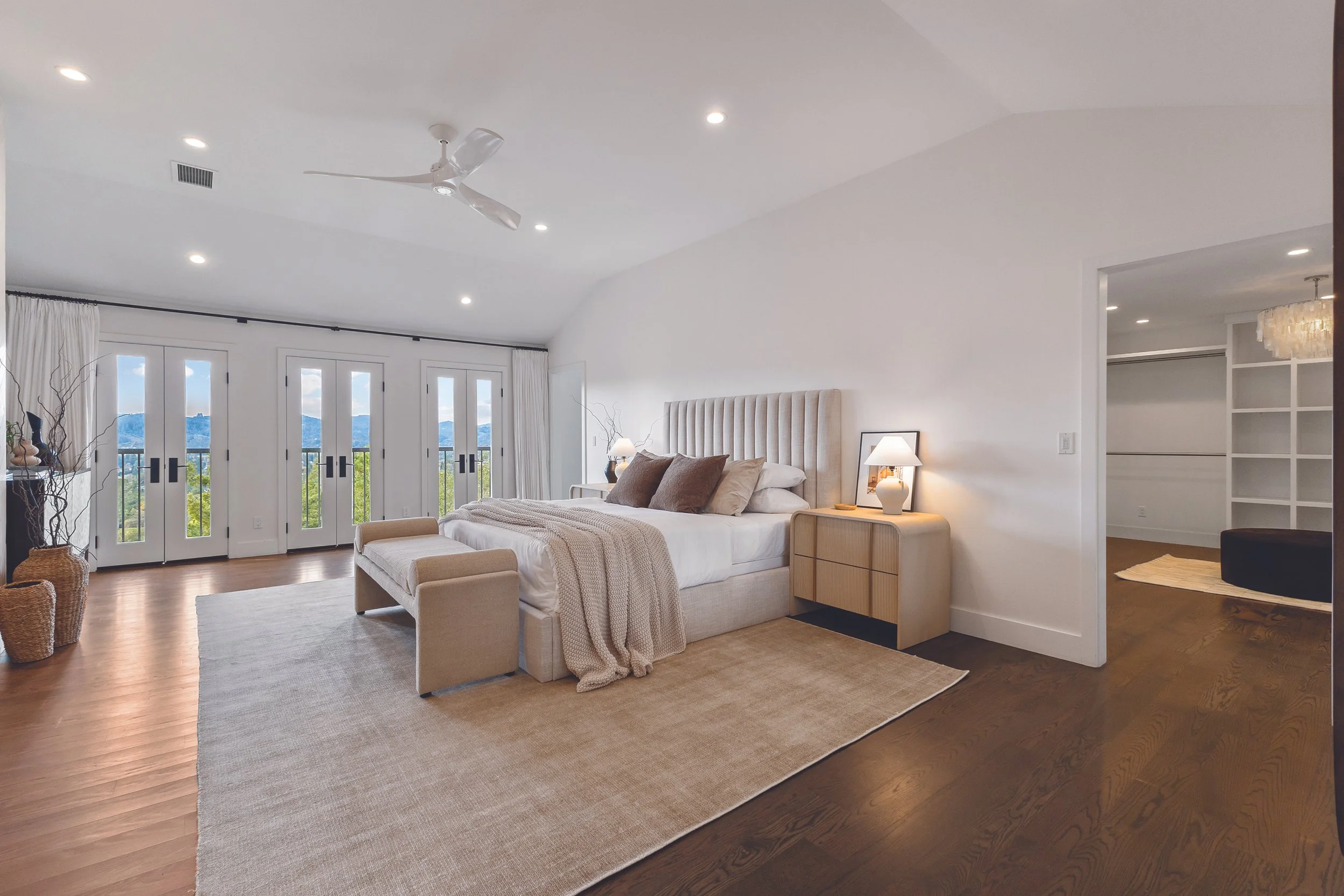 The chef’s kitchen features premium appliances and a built-in espresso station, flowing seamlessly into the dining area highlighted by a dramatic glass-front wine display. French doors open to a wraparound covered porch, creating effortless indoor-outdoor living against a backdrop of panoramic views.